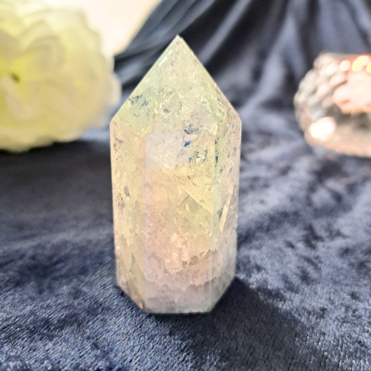 オーラクリスタルを人工的に加工することで、光が当たる度にプリズムのような美しい輝きを放ちます。